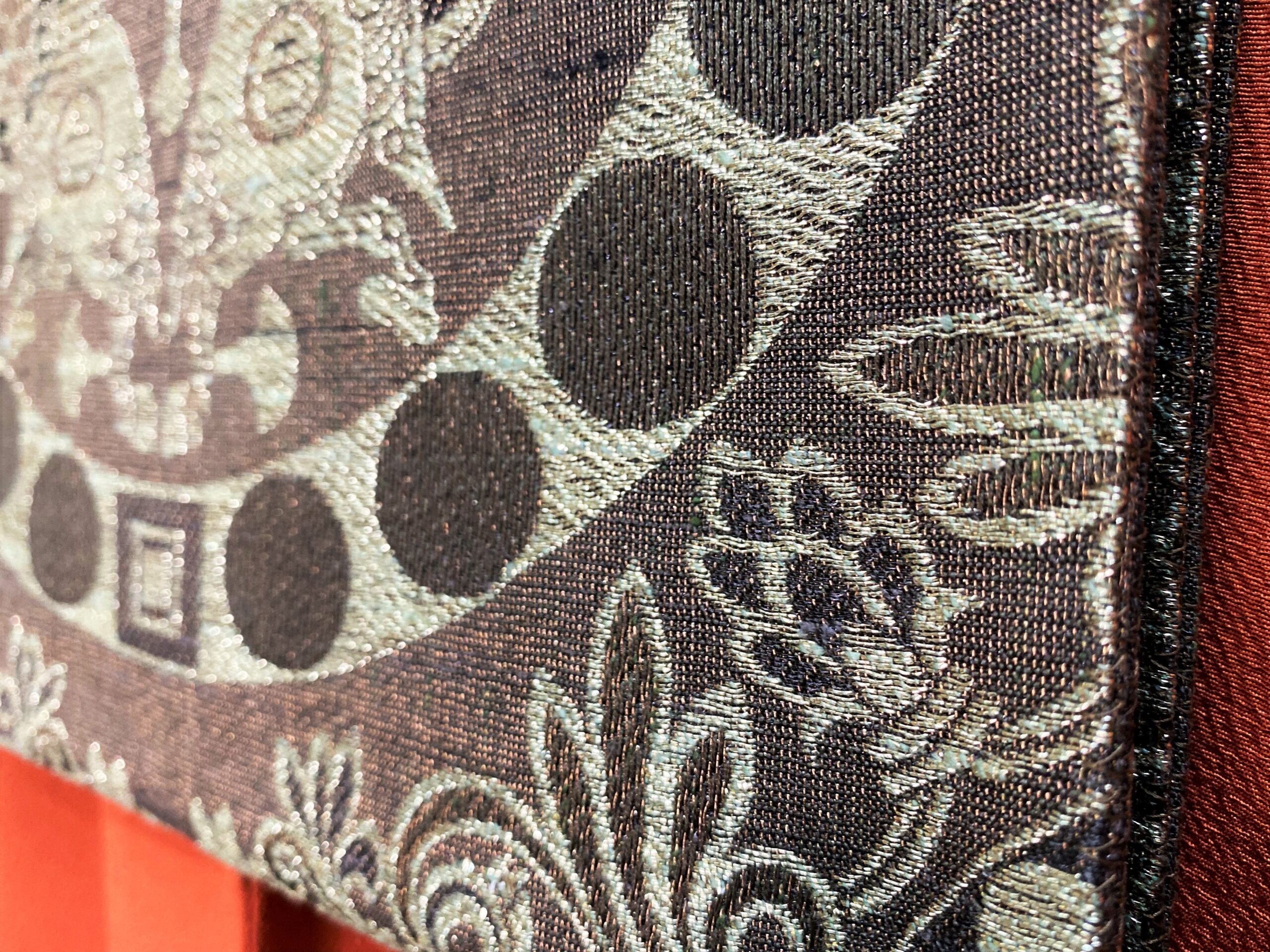 配色ではうるしの箔を使った「ねん金糸」を帯地に使用し、しっとりとモダンに仕上げました。