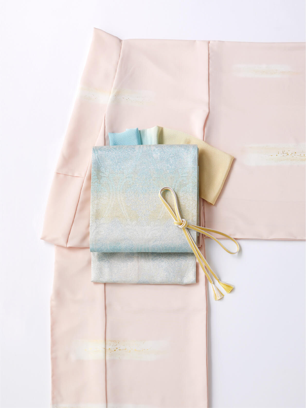 「DEAI」・「KISEKI」・「TSUNAGU」それぞれの帯すべてと調和する、手描き京友禅の訪問着「霞ぼかし」。