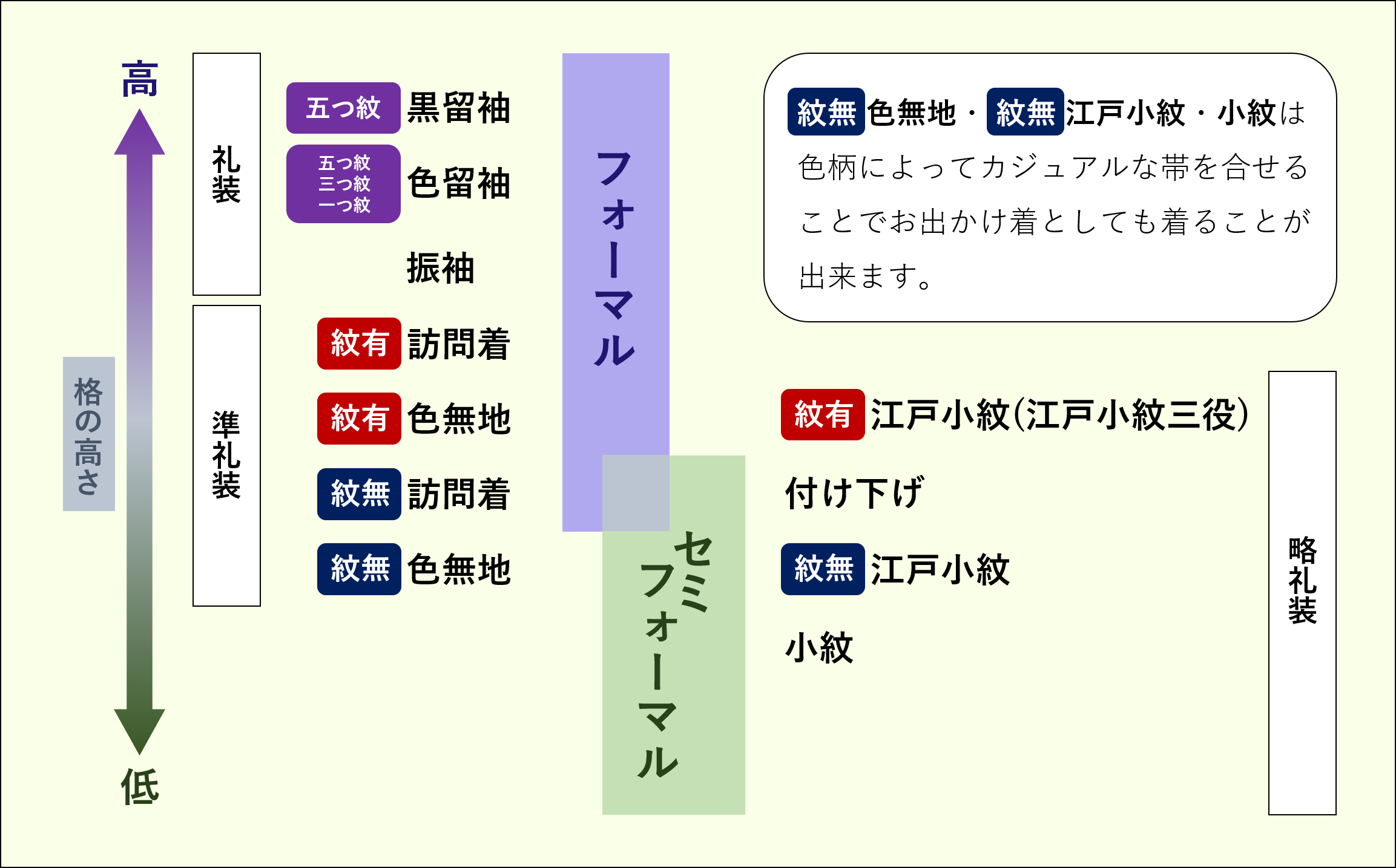 フォーマル・セミフォーマルの着物の種類をご紹介してきましたが『紋が入ると格が上がる』『江戸小紋三役は格が高い』など、「結局何がどれ…?」と混乱してまう方も多いはず…!