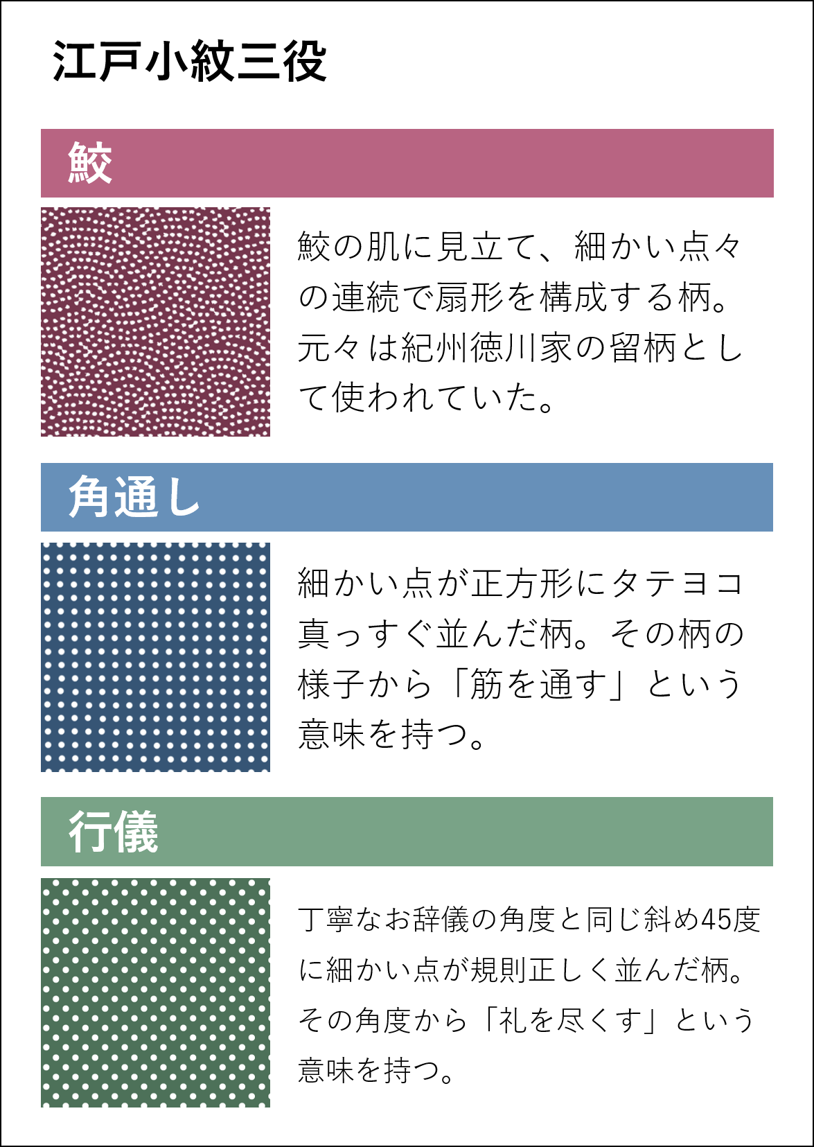 また、江戸小紋の中でも「江戸小紋三役」と言われる「鮫(さめ)」「角通し(かくどおし)」「行儀(ぎょうぎ)」の柄は特に格が高いとされています。