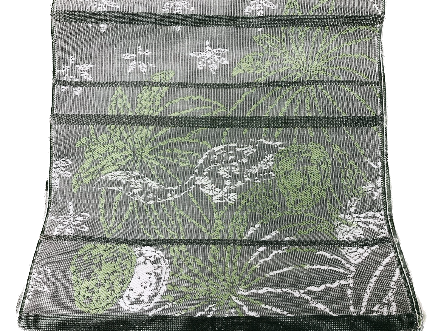 着用時期については、オールシーズン締められる帯を目指して目の詰まった畦地と夏帯によく使用される目の粗い紗地を取り入れた組織を採用。