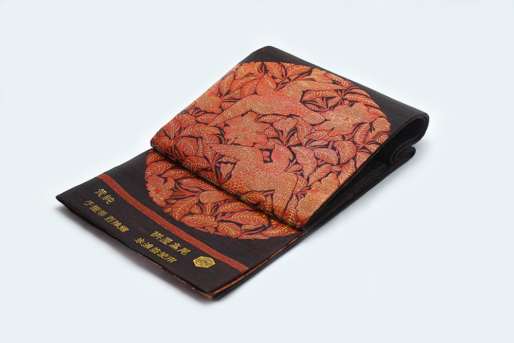 こちらは黒地に映える朱漆箔が印象的な手織りの袋帯です。