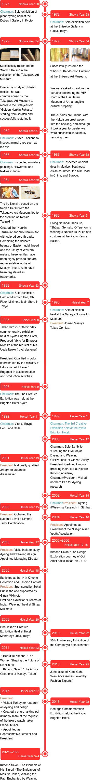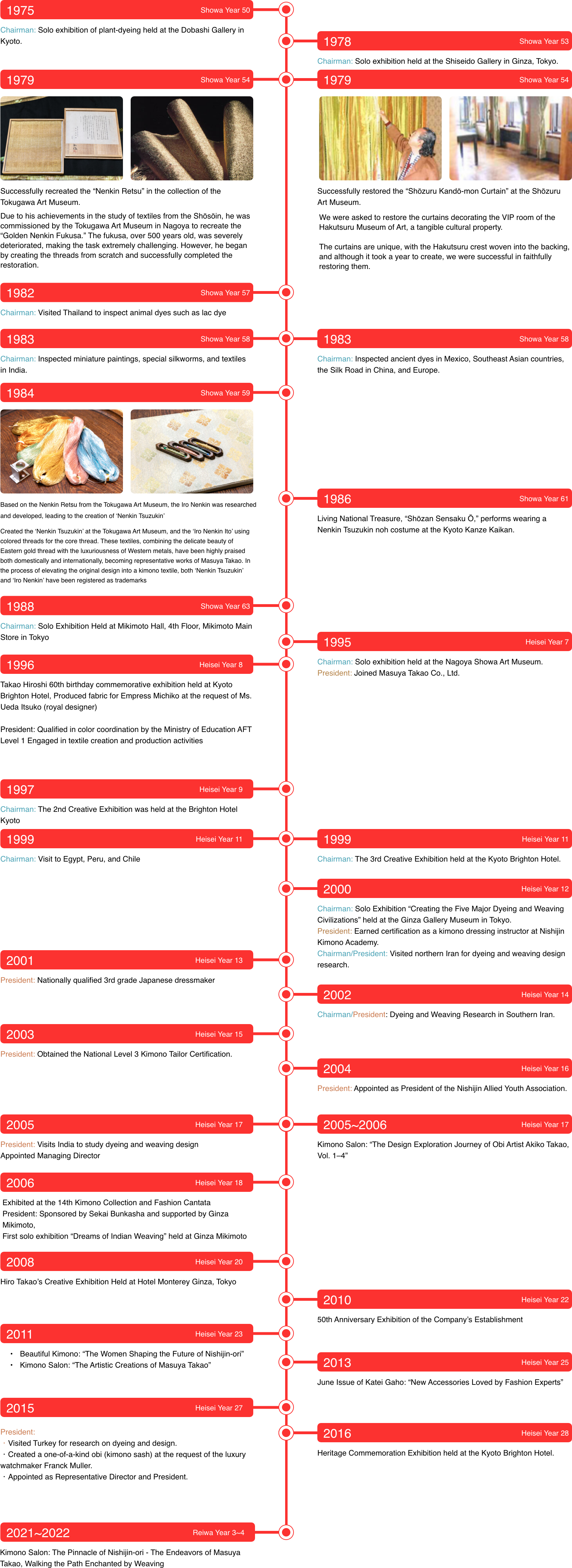 Since founding Masuya Takao in 1960, I have inherited and refined the traditional techniques of Nishijin while creating works with my unique skills. I hope to continue producing “beautiful textiles that withstand the test of time.” I sincerely wish to see an increasing number of customers whose hearts are uplifted by the kimonos and obis of Masuya Takao.
